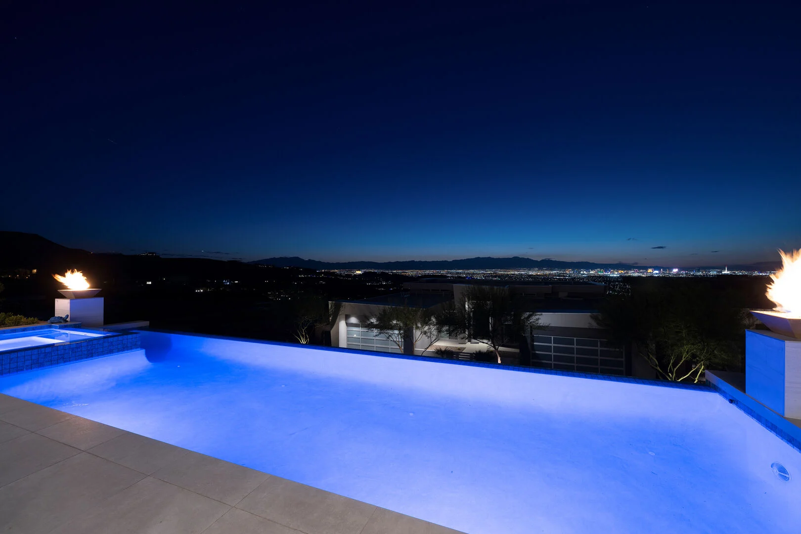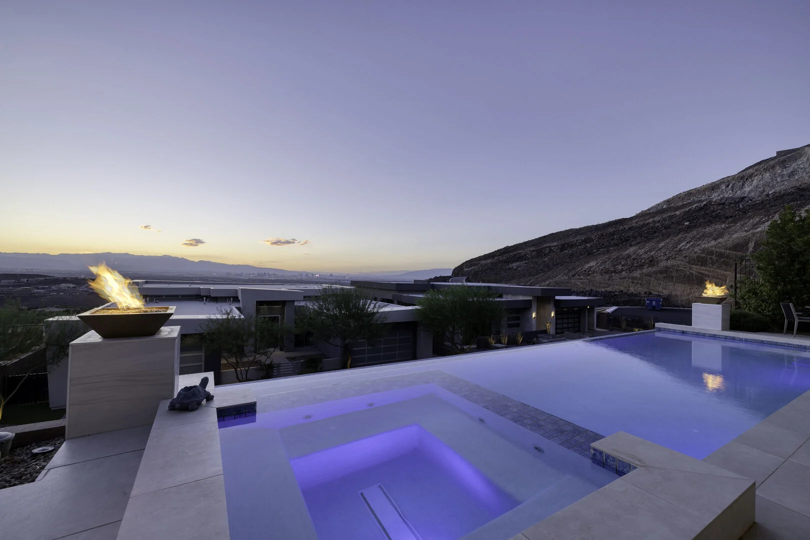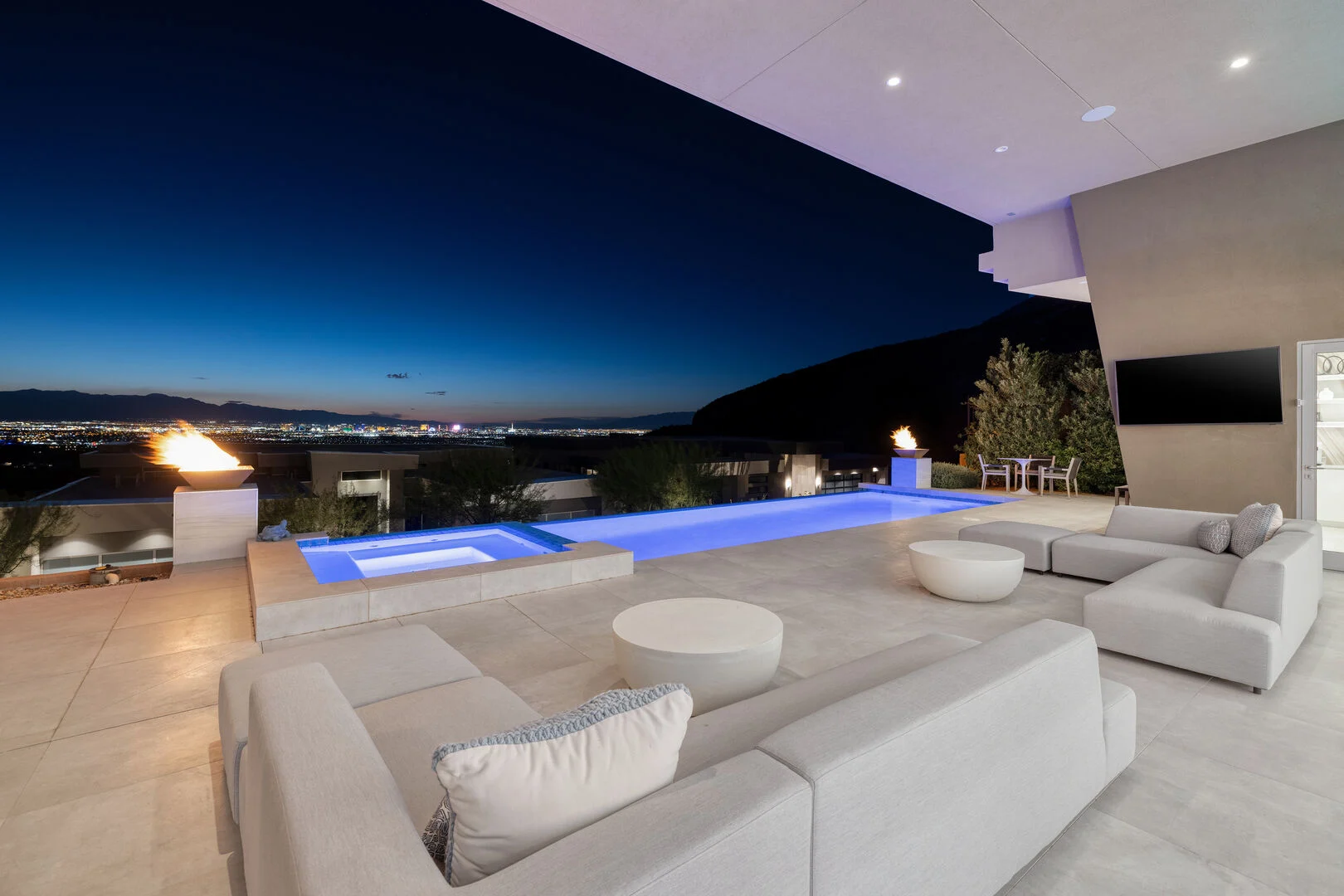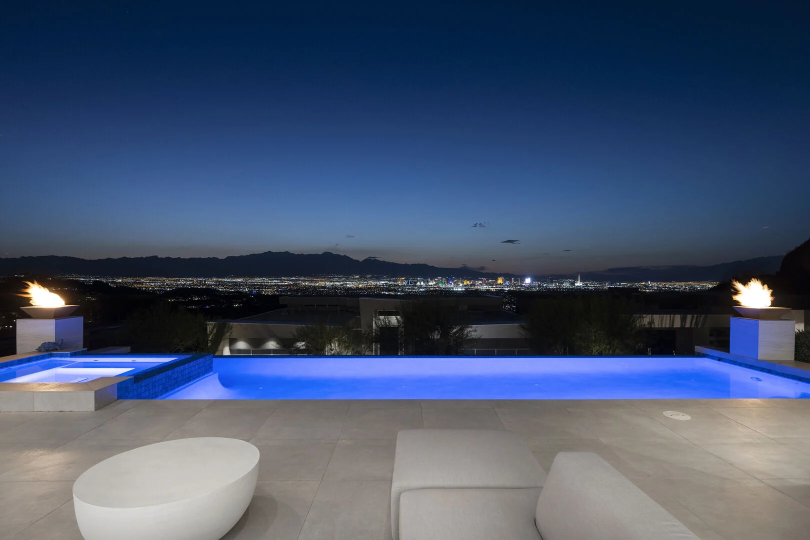 The perfect escape from the bustling Strip, this private luxury villa captures panoramic city and mountain views from its exclusive position in the MacDonald Highland Hills, 20 minutes from Las Vegas. Inside and out, this modern villa was made to entertain. Spend your stay lounging by the pool, grilling on the patio, or sipping wine in the hot tub. When ready, Vegas awaits.