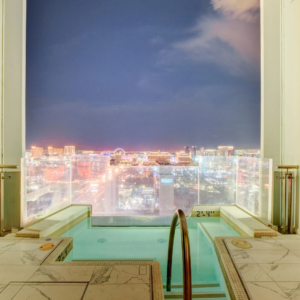 An infinity-edge spa extends off of a private balcony toward the Vegas skyline. Live like a celebrity! This 3,400-square-foot unit has custom lighting, hardwood flooring and wood wall treatments. Walls of glass take in unobstructed views of the downtown cityscape, World Famous Las Vegas Strip, and surrounding valley.