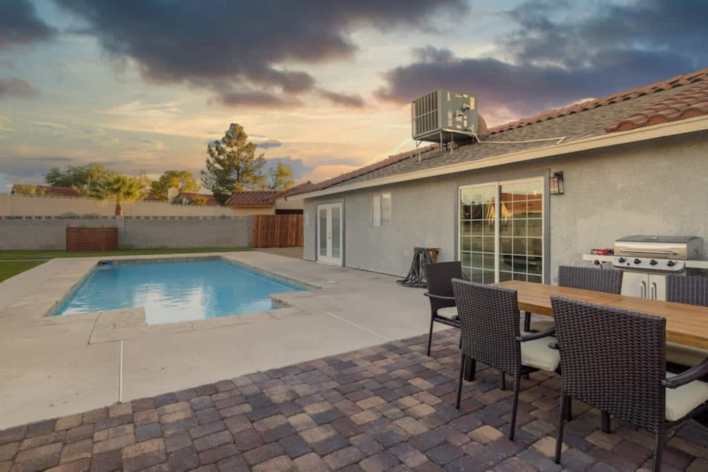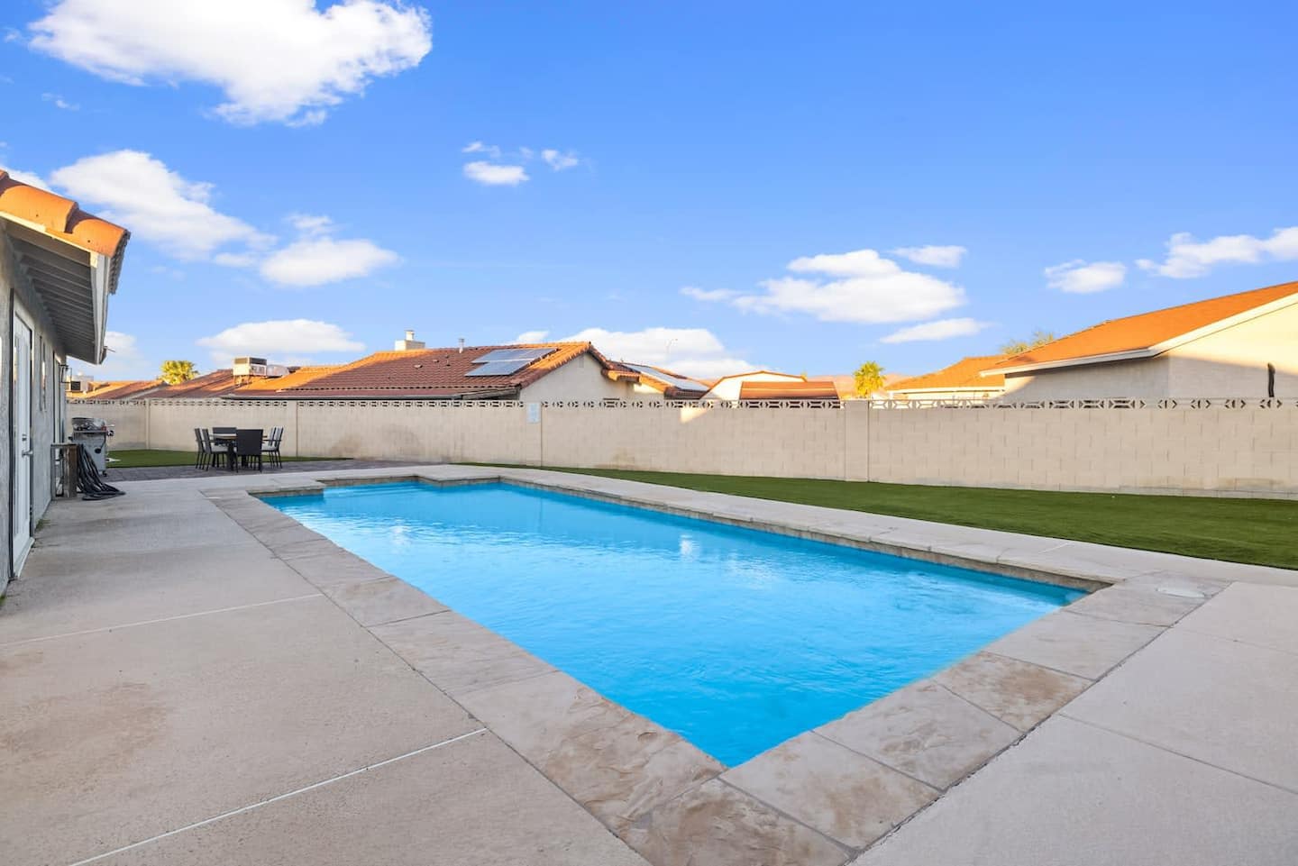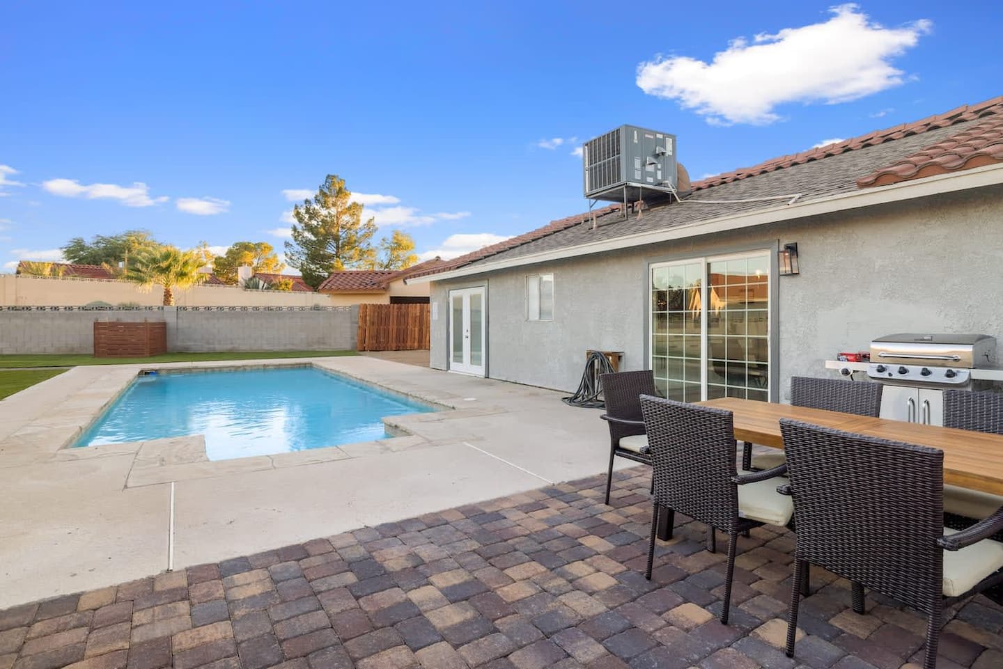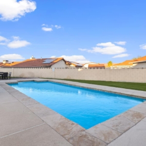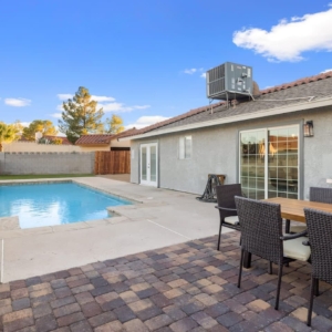Bright and modern pool property in Henderson with jacuzzi. The large swimming pool and BBQ are ready for you to unwind after a day of fun in Vegas or in the boundless outdoors amenities in Henderson. Enjoy your own cozy space with 3 bedrooms, a modern kitchen to prepare meals in, and a relaxing living room with a fireplace. The home is equipped with smart televisions to stream all your favorite channels from home. Meticulously designed and prepared for you – be among the first to enjoy this home and all its brand new furniture and decor.